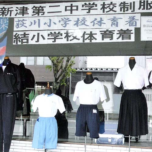 1F資生堂、ハリウッド化粧品、洋品、婦人服、手芸品。結・荻川小学校体操着取扱店、新津第二中学制服・カバン、体育着取扱店(刺繍修理無料)。